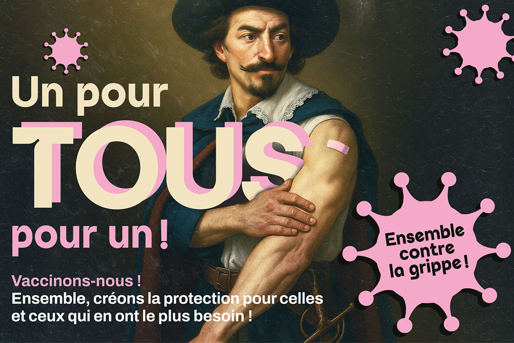 La campagne romande contre la grippe fait son retour. Cette année, son visuel met en scène un mousquetaire se faisant vacciner, en écho à la devise nationale et à l'écrivain Alexandre Dumas : « Un pour tous, tous pour un ! ». Symbole de solidarité et d’esprit d’équipe, cette image rappelle que, comme les mousquetaires, les professionnel·le·s de la santé unissent leurs forces pour protéger les autres. Elle incarne à la fois les valeurs de dévouement et de protection collective qui sont au cœur de la vaccination.
